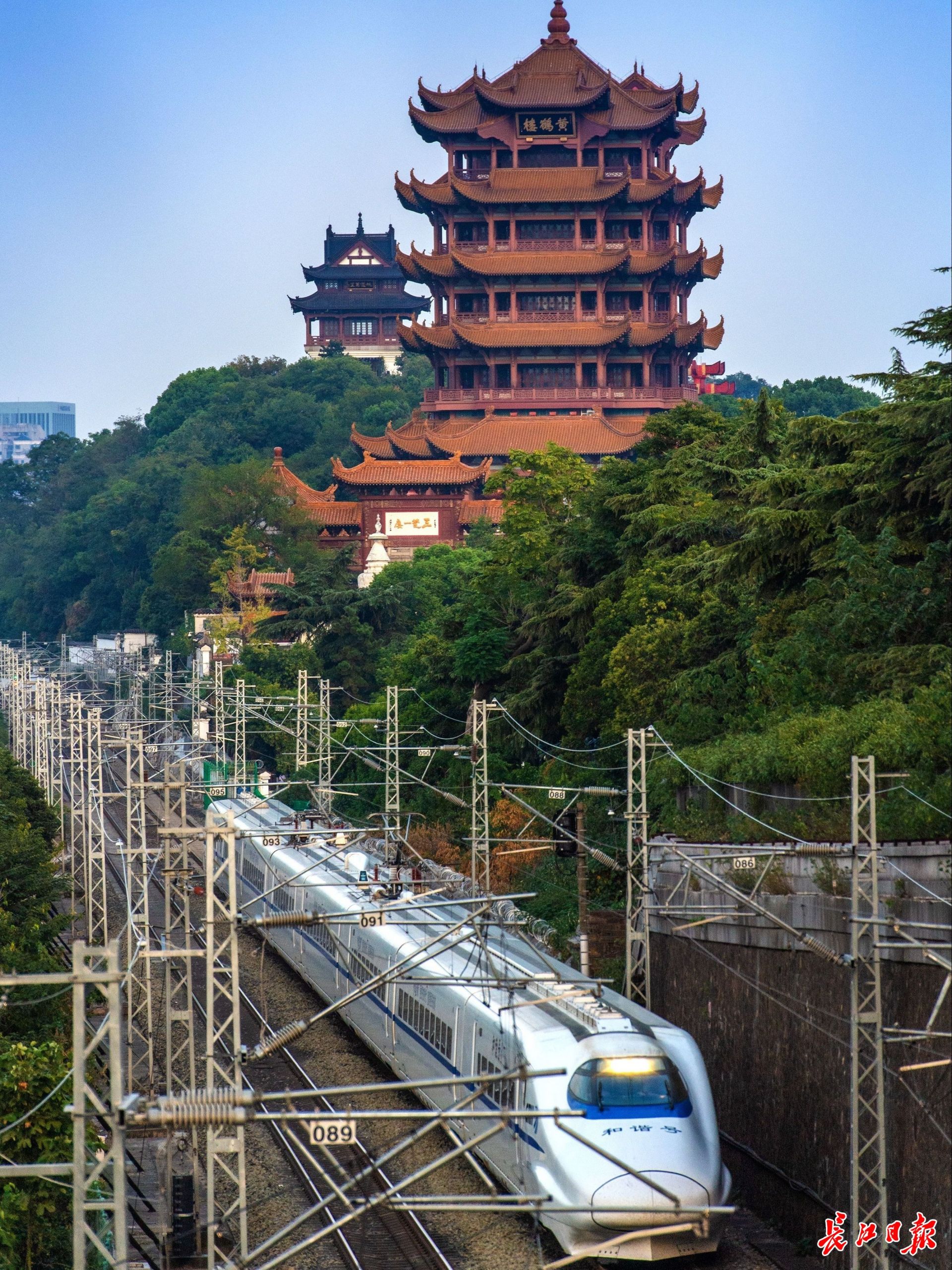 黃鶴樓與“和諧號”動車同框。(長江日報資料圖)