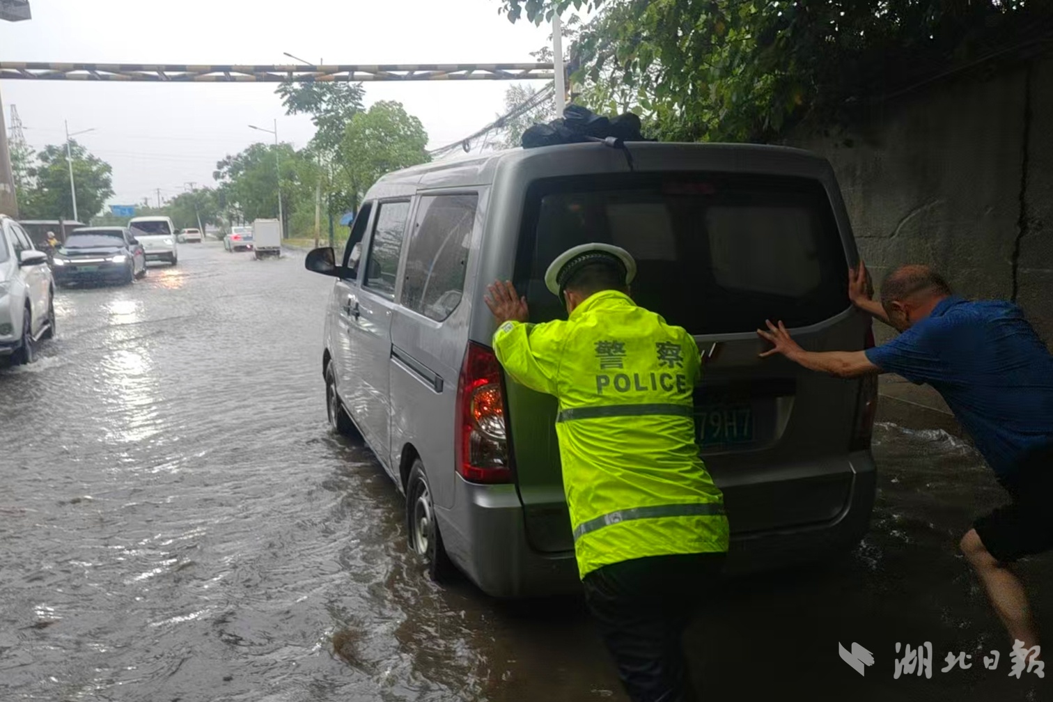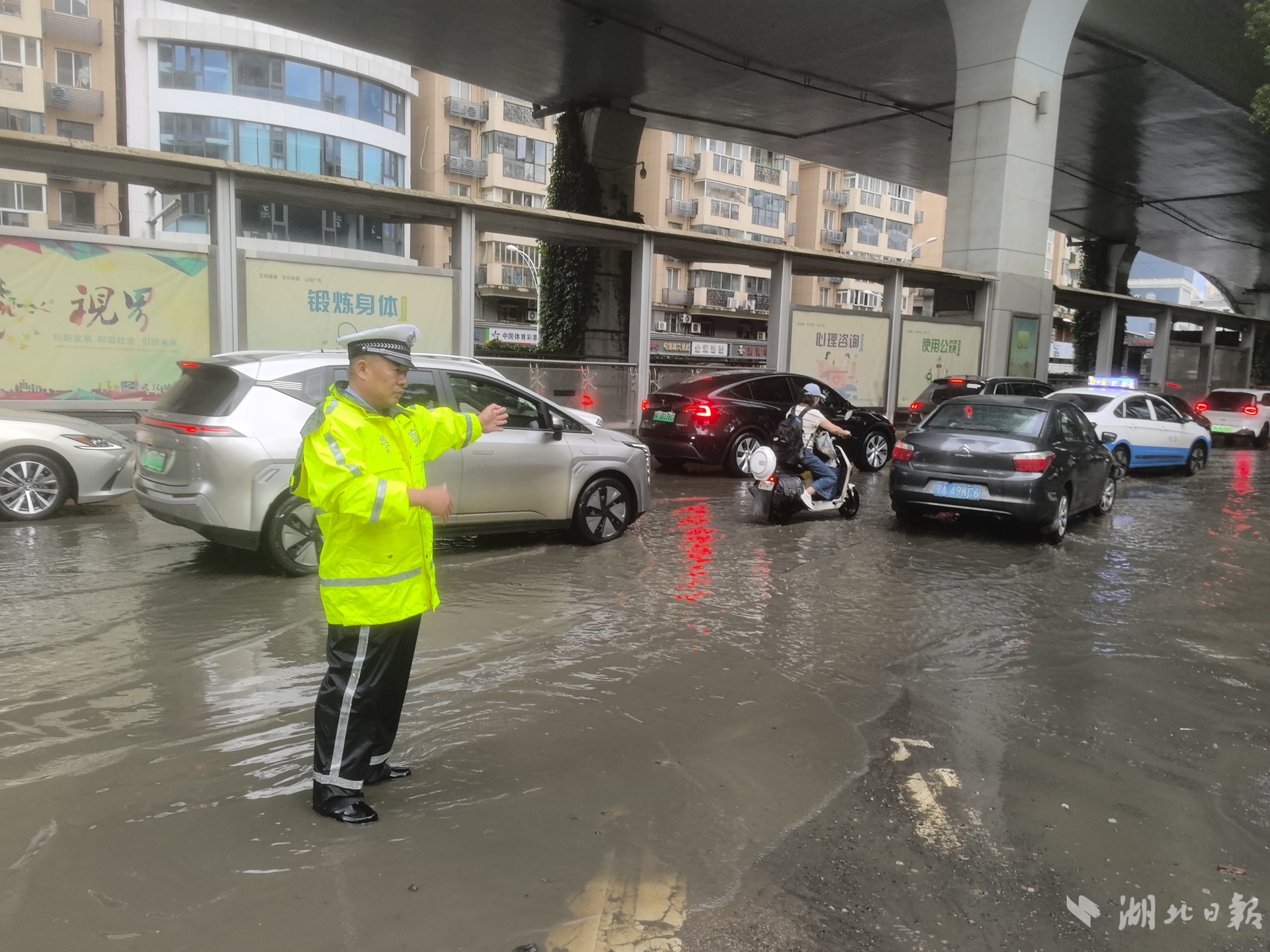 15時許,武昌交警在小東門、中北路洪山廣場下穿通道等重點路段全力疏導交通擁堵路段,保障道路暢通;洪山交警冒雨在三環線快速路,對一輛因故障拋錨的面包車進行救援。