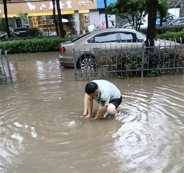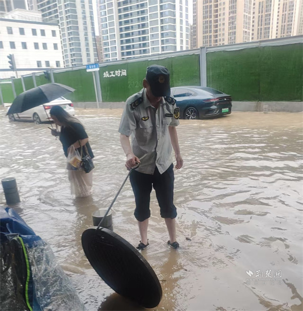 在風華天城易積水區(qū)域,工作人員啟動大功率水泵持續(xù)抽排,設(shè)置警示標識并安排專人值守,隨時掌握水位變化情況。巡查中,工作人員同步對各小區(qū)周邊的排水設(shè)施進行全面檢查,清理堵塞排水口的雜物,針對大面積積水點位,打開下水井蓋緊急排水,并做好路面的警戒和行人疏散工作。