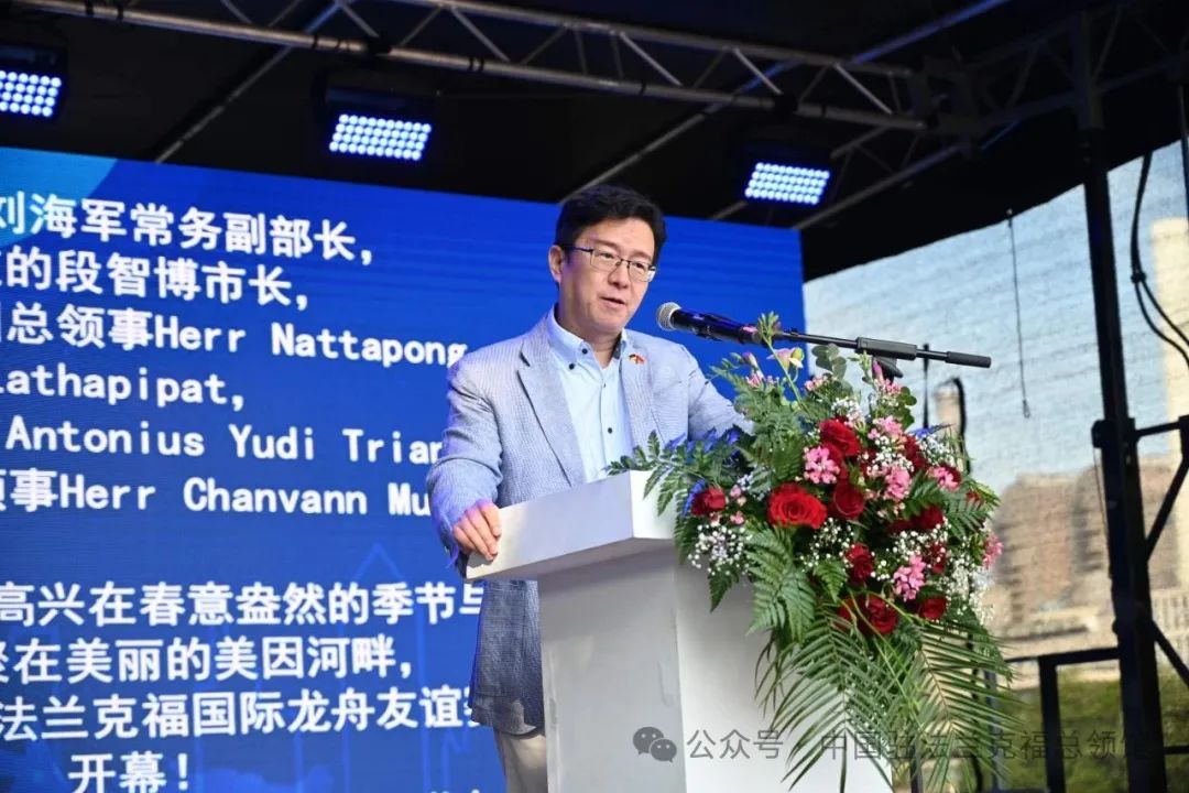 5月24日,第二屆“紅旗杯”法蘭克福國際龍舟友誼賽在美因河上隆重開幕。中國駐法蘭克福總領(lǐng)事黃昳揚、湖北省委宣傳部常務(wù)副部長劉海軍、陜西省神木市市長段智博與泰國、印尼駐法蘭克福總領(lǐng)事和柬埔寨駐法蘭克福名譽領(lǐng)事出席并致辭,中德政治、經(jīng)濟界代表、華僑華人、法蘭克福市民等近萬人齊聚美因河畔,共同見證來自德國、法國、意大利、美國、泰國等地的17支龍舟隊伍乘風破浪,揚帆啟航。