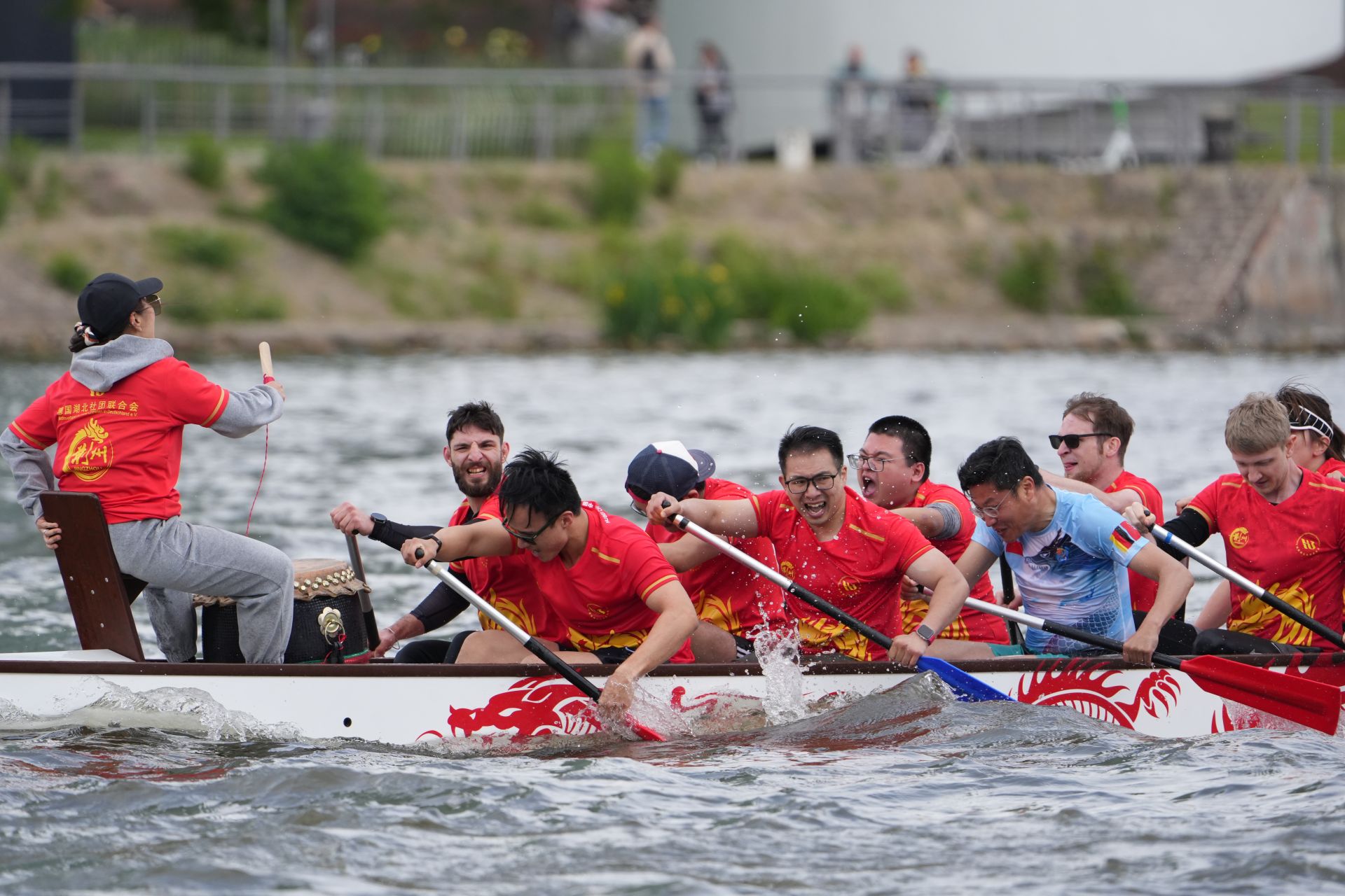 當(dāng)?shù)貢r(shí)間5月24日,第二屆“紅旗杯”法蘭克福國(guó)際龍舟友誼賽在萊茵河支流美因河上激情開(kāi)賽。來(lái)自中國(guó)、德國(guó)、法國(guó)等國(guó)家的18支龍舟隊(duì)在此劈波斬浪。其中,代表中國(guó)參賽的荊州隊(duì)驚艷亮相,荊州龍舟隊(duì)身穿紅色隊(duì)服,隊(duì)旗和隊(duì)服上有醒目的中國(guó)龍和湖北、荊州字樣。