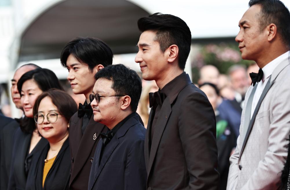 5月24日,在法國南部小城戛納,中國影片《狂野時代》導演畢贛(右五)攜主創人員踏上閉幕式紅毯。新華社記者 高靜 攝
