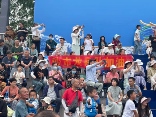 兩天里,護城河沿岸圍滿了前來觀賽加油的市民。觀眾的加油聲、孩童的尖叫聲與水面?zhèn)鱽淼墓穆暎b相呼應(yīng)、此起彼伏。