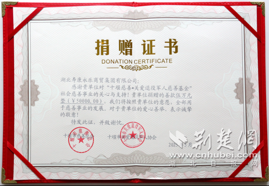 在抓好企業轉型發展的同時,壽康永樂集團始終牢記黨恩,勇于擔當社會責任,積極投身到關愛退役軍人等社會慈善公益事業當中,做向善的組織者、做行善的踐行者、做揚善的引導者,贏得社會各界的盛譽。十堰市關愛退役軍人協會副會長,壽康永樂集團黨委書記、董事長、總裁王國華也被授予“十堰首屆關愛退役軍人愛心大使”榮譽稱號。