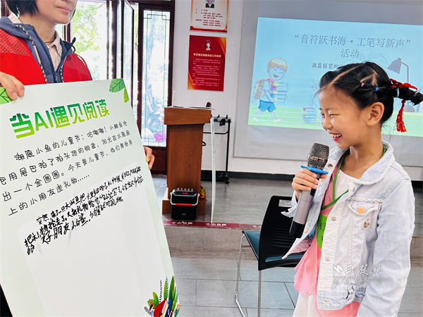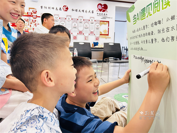 當傳統閱讀邂逅科技浪潮,“AI故事工坊”成為最大亮點。社區工作人員演示智能創作系統,以“當AI遇見閱讀”為主題生成故事開篇,孩子們分組圍繞“湖底小魚的兒童節”“武昌古城的兒童節”展開接龍創作。“突然,一只大鯊魚把小魚吃了,還把禮物搶走了”……趙胤祖同學接過AI生成的神秘開頭,續寫出小魚與大鯊魚的感人故事。“AI生成懸疑的開頭,在我和小伙伴的續寫后變成溫馨的友誼故事,這種轉折太酷了!”孩子們天馬行空的想象力為故事插上奇妙的翅膀,讓文字在紙板上翱翔。