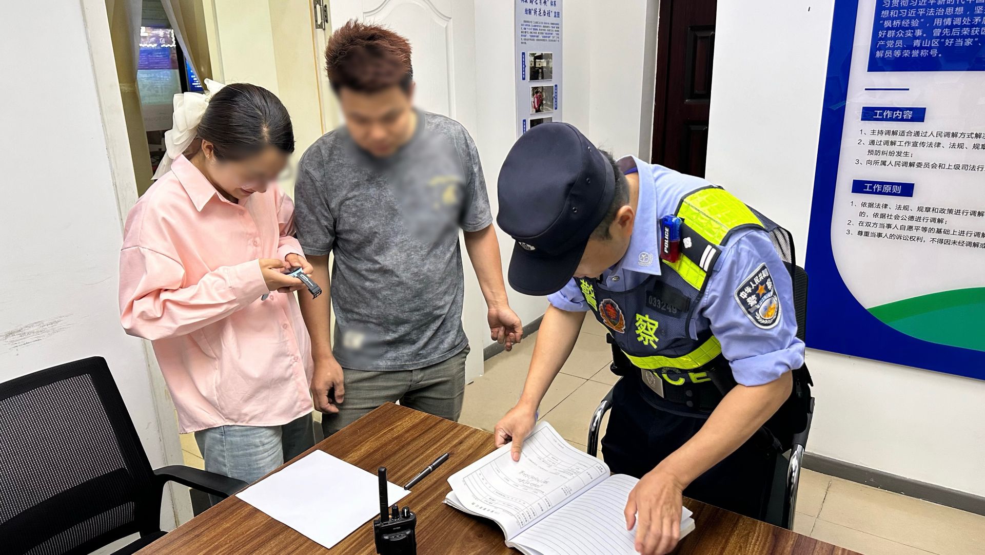 了解事情原委后,隊員任立新、李思瑾、李睿詩及時勸導疏散圍觀群眾,民警張超則一邊耐心傾聽雙方的訴求,一邊擺事實、講道理、普法律,對雙方進行勸導。