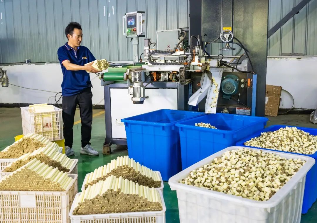 鮮艾草除了進入市場,還會被送入艾草深加工車間。車間里,工人們正將干艾葉送入壓絨生產線,通過碾壓、分離等工藝制成細膩的黃灰色艾絨。經過精準稱重、卷制、定型等工序后,艾絨被轉化為艾條、艾柱、艾香等產品。吳蘇林表示:“艾葉經取、磨、挑、錘、篩五道工序后,可制成艾絨。艾灰用于足浴包,艾渣則作為飼料原料,實現資源全利用?!?/p>