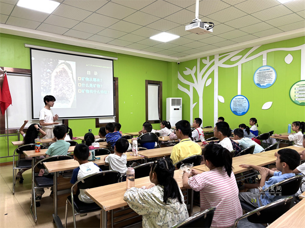 活動伊始,科普講師向小朋友們展示了雄黃、雌黃、硫、鉛、螢石、水晶、金剛石等色彩斑斕、形態各異的礦物標本。這些美麗的礦物瞬間吸引了小朋友們的目光。隨后,講師從地球的結構講起,為小朋友們普及了巖石與礦物在地球中的位置,詳細介紹了巖漿巖、沉積巖、變質巖三大類巖石及其形成過程。