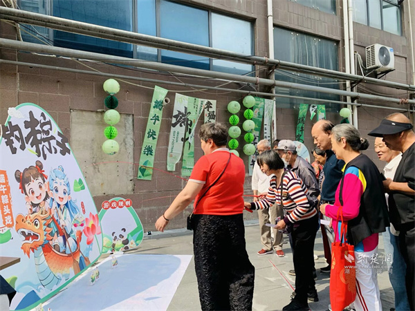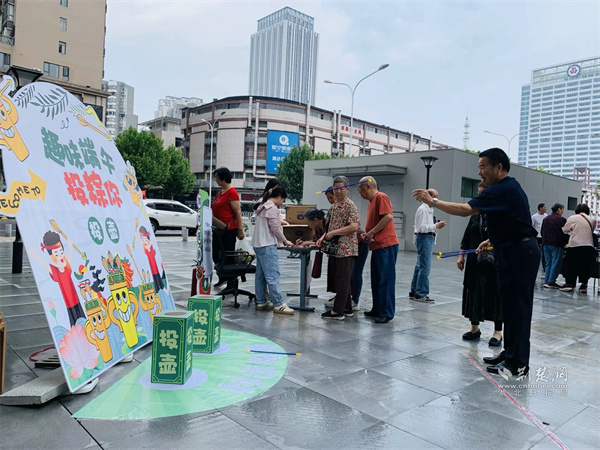 活動以端午起源故事分享拉開序幕,主持人帶領大家重溫屈原愛國情懷,并通過互動問答普及端午習俗。在“粽橫江湖”游戲中,居民手持魚竿釣取粽子模型,釣中即可兌換實物粽子;“祛邪納吉”飛鏢環節將“避五毒”傳統融入游戲,靶盤上的蜈蚣、蝎子等圖案引得大家爭相投擲祈福;“投壺破穢”現場,參與者模仿古人執箭投壺,在趣味中體驗傳統禮儀。