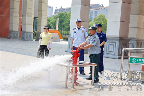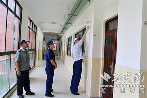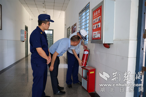 荊門市掇刀區消防救援大隊防火監督員對高考考點消防設施進行抽查。通訊員 供圖