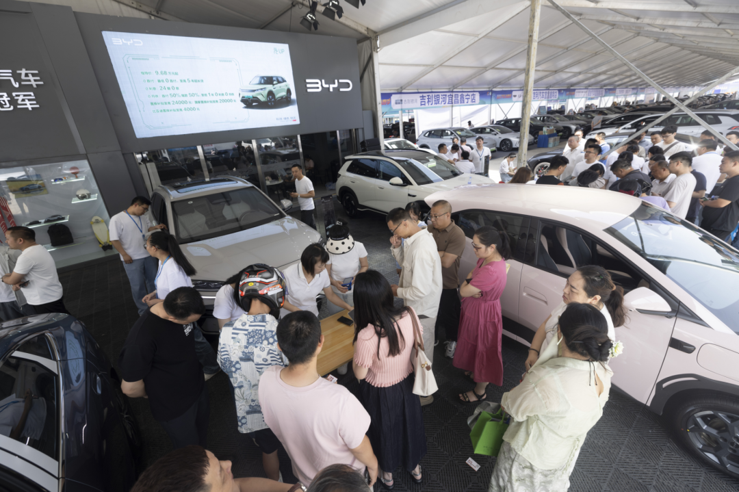 “購車立減2000—4000元!”上周末,天元國際汽車城里的宣傳廣告格外醒目,比亞迪幾個展位人聲鼎沸,5月23日全品牌單日刷卡訂車量超過270臺,比亞迪王朝華康天元店店長劉曉巍的手機不斷彈出成交提醒。“省、區、市三級補貼疊加,就像三股合力推動消費車輪。”他指著展臺內看車的人群說,“差不多20%的客戶是因為補貼提前購車。”