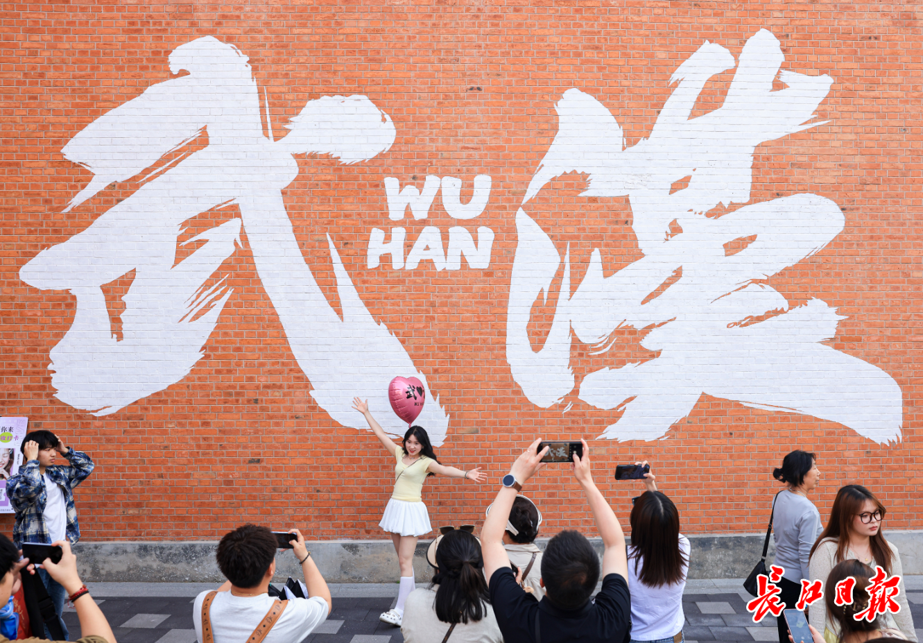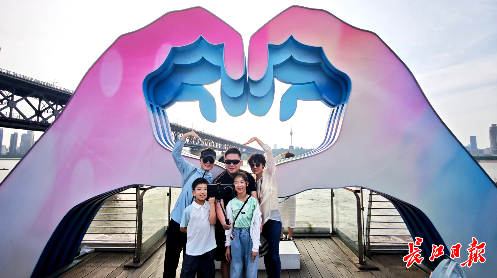 武漢長江大橋前,“比心”墻臨江而立,吸引游客合影。記者何曉剛 攝