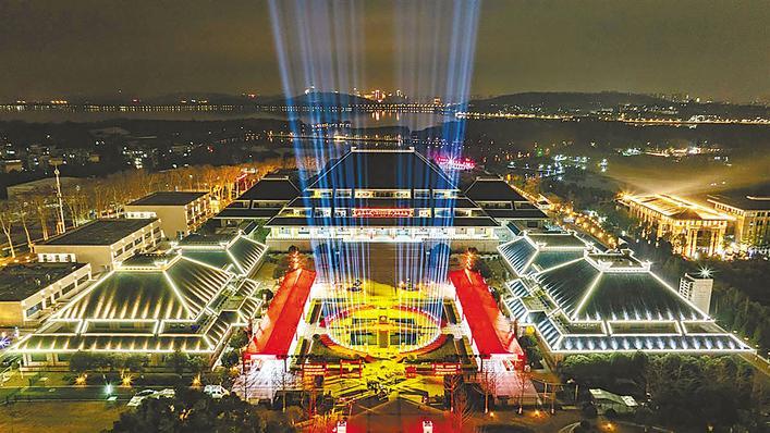 2月11日晚,湖北省博物館“鐘鳴楚天元宵夜”燈會正在緊張彩排。 (湖北日報全媒記者 何宇欣 攝)