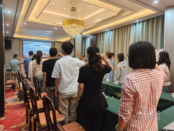 當激昂的國歌聲響起,全體人員莊嚴肅立,齊聲高唱。在水墨江南黨支部書記陳金勝的領誓下,大家右手握拳,莊嚴宣誓,鏗鏘有力的誓言在會場中久久回蕩,彰顯著共產黨員的使命與擔當。