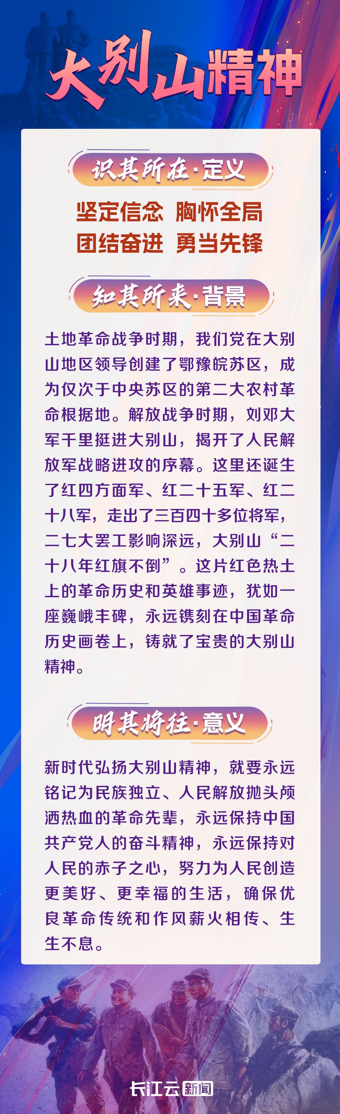 2024年11月,習近平總書記考察湖北,對湖北的發展提出了更高定位、更高標準、更高要求,強調要“大力弘揚大別山精神、抗洪精神、抗疫精神,廣泛踐行社會主義核心價值觀”。