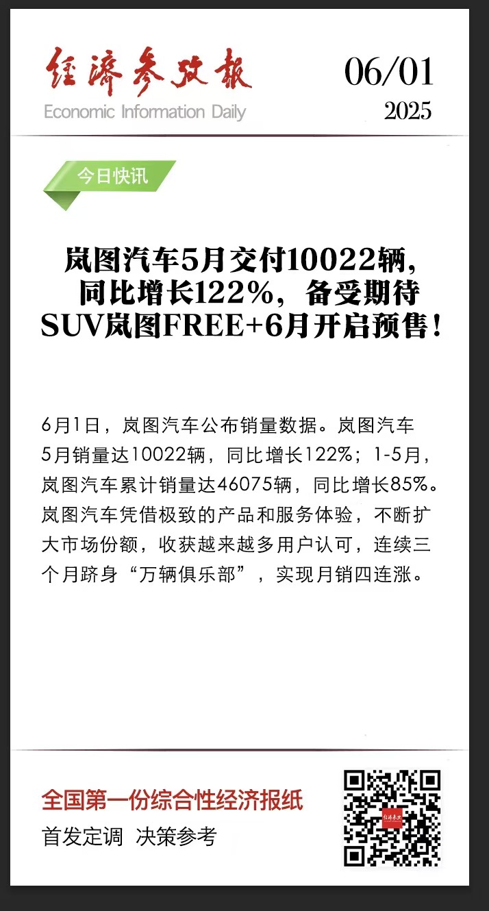 6月1日,嵐圖汽車公布銷量數(shù)據(jù)。嵐圖汽車5月銷量達(dá)10022輛,同比增長122%;1-5月,嵐圖汽車?yán)塾?jì)銷量達(dá)46075輛,同比增長85%。嵐圖汽車憑借極致的產(chǎn)品和服務(wù)體驗(yàn),不斷擴(kuò)大市場(chǎng)份額,收獲越來越多用戶認(rèn)可,連續(xù)三個(gè)月躋身“萬輛俱樂部”,實(shí)現(xiàn)月銷四連漲。