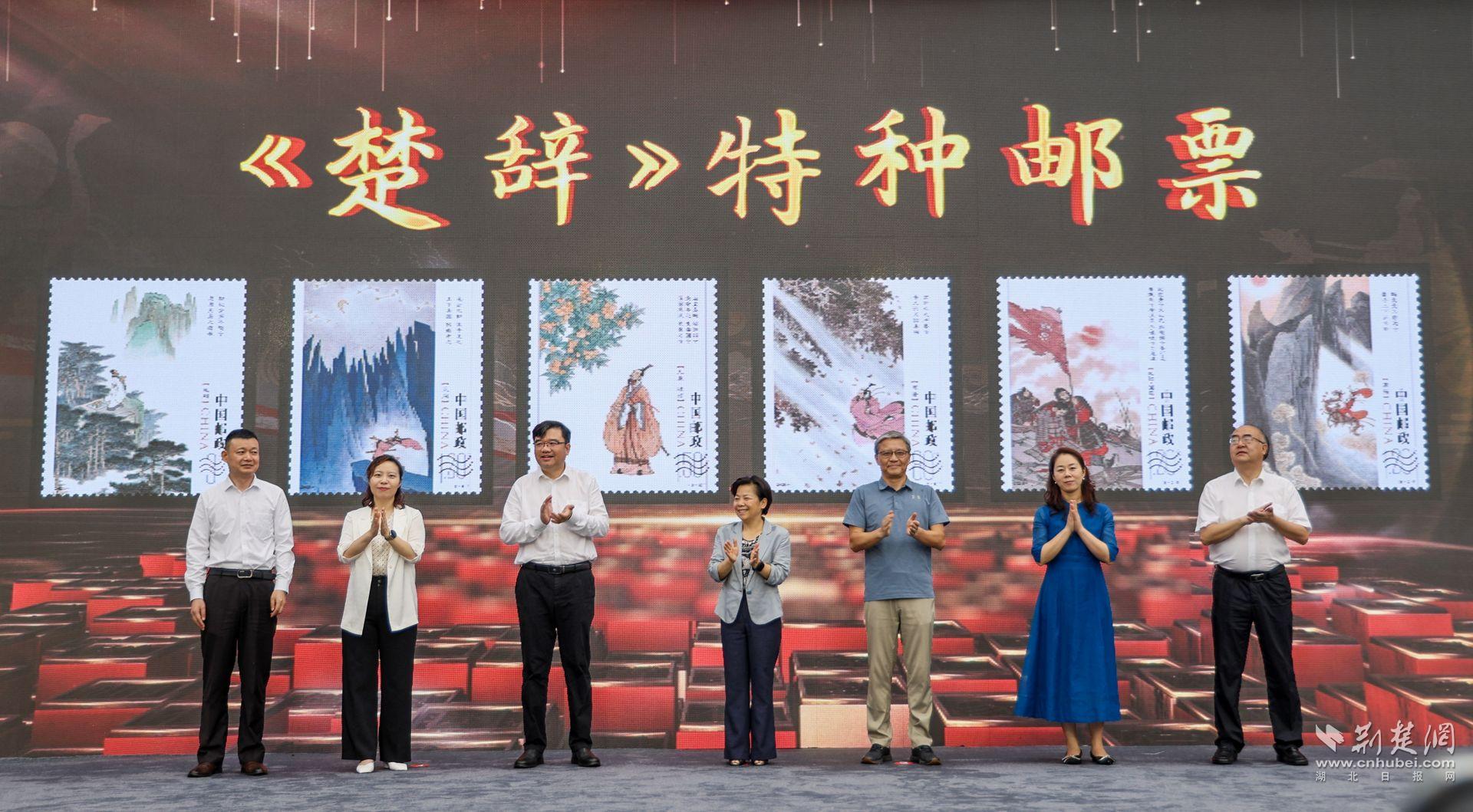 隨后,中國郵政集團有限公司湖北省分公司寄遞事業部副總經理董紅霞宣讀郵票發行公告;嚴紅、劉俊等7位嘉賓共同為《楚辭》特種郵票揭幕。