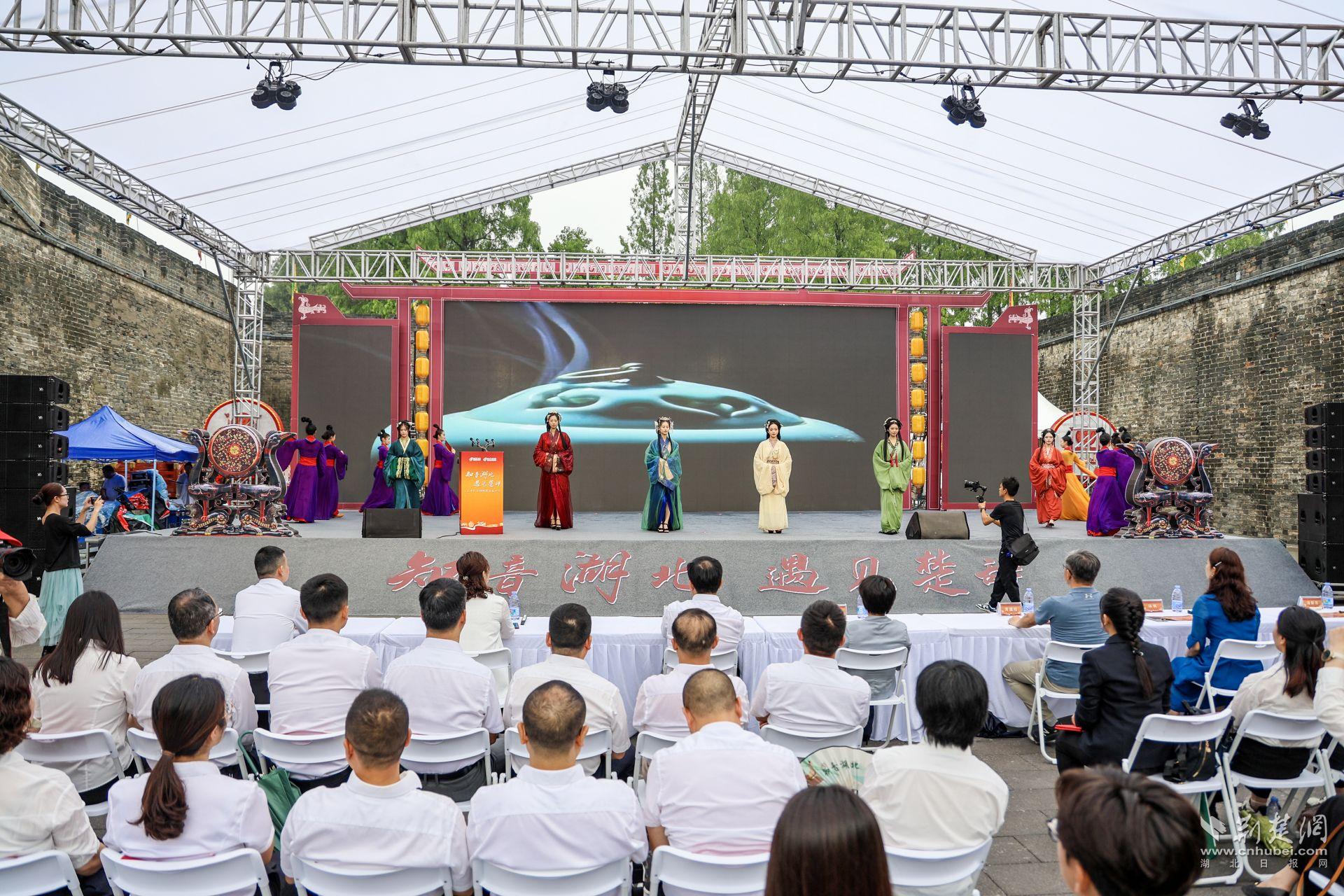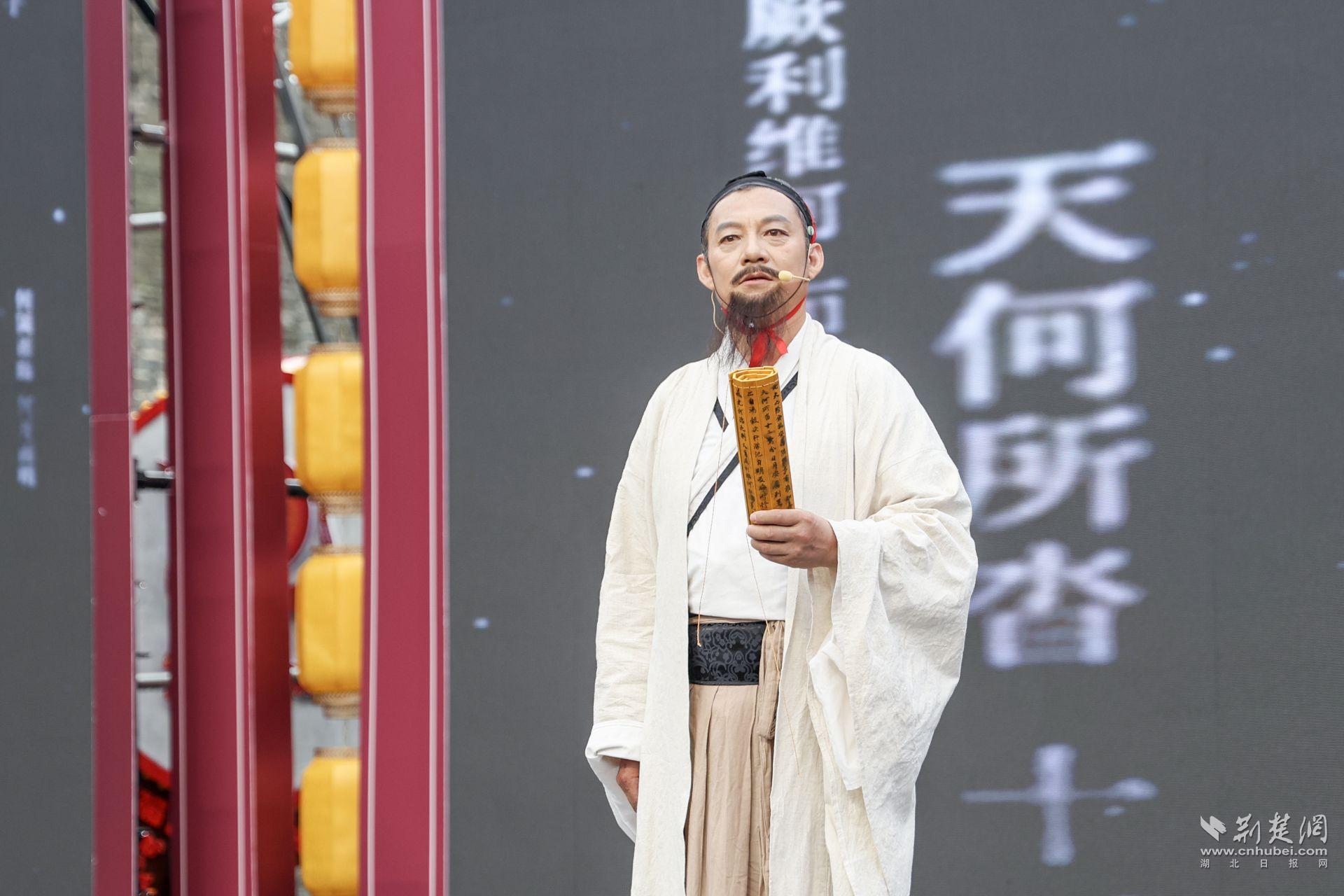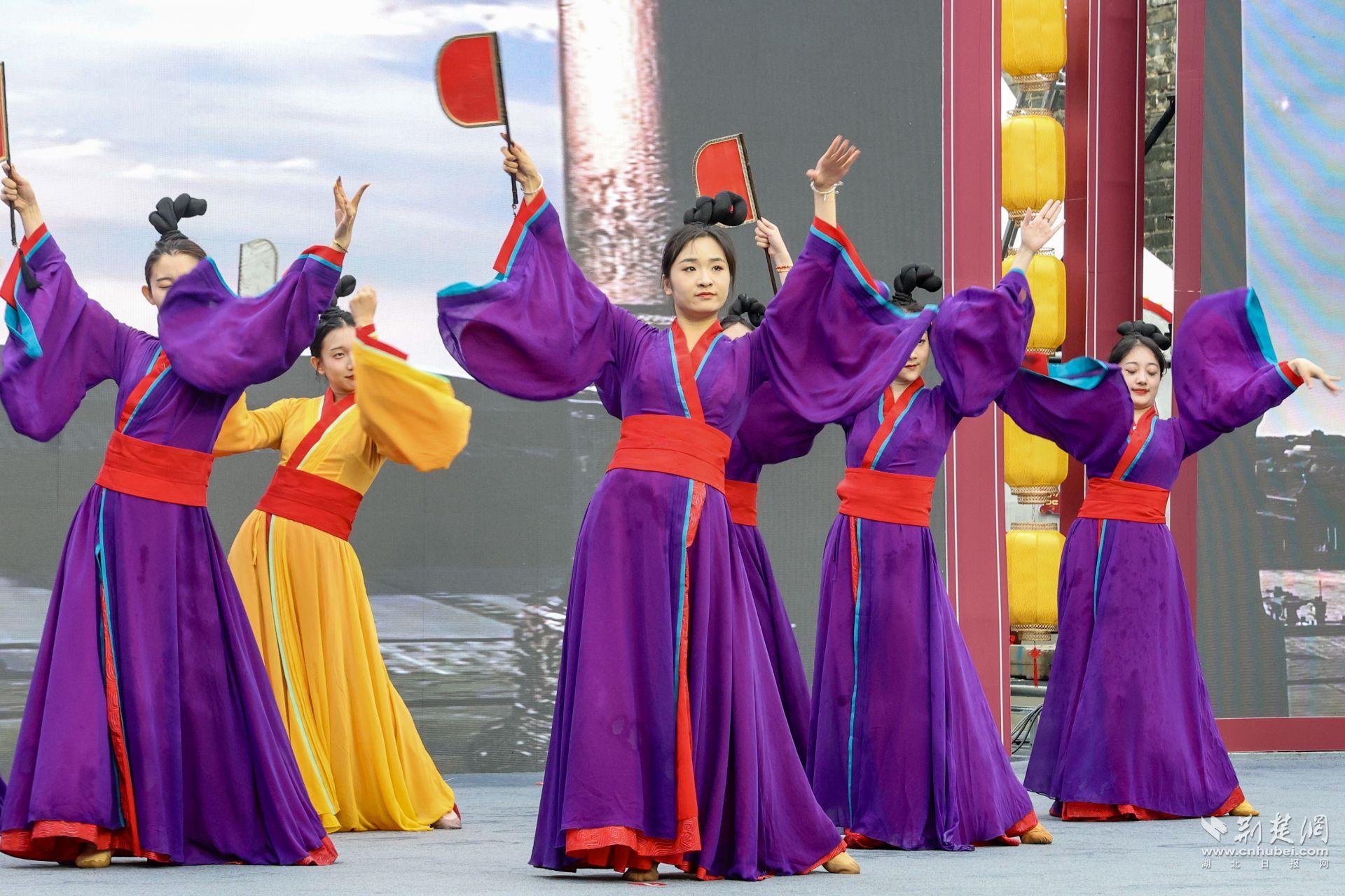 上午8時30分,活動嘉賓陸續踏入賓陽樓甕城,身著古裝的工作人員為其遞上《楚辭》主題宣傳冊,古樂迎賓曲與《楚辭》郵票宣傳片交織,拉開活動序幕。9時10分,開場秀《楚韻霓裳戰舞風華》震撼上演,演員們以楚繡紋樣深衣搭配現代舞美,重現“帶長鋏之陸離兮,冠切云之崔嵬”的楚地風華,剛柔并濟的舞姿與古城墻背景相映成趣,贏得現場掌聲雷動。