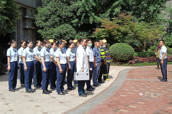 當日下午,隨著一陣急促警報聲響起,消防演練正式啟動。此次演練模擬小區樓棟內因電路短路引發火災的場景。物業服務中心在接到火災警報后,迅速啟動消防應急預案,各應急小組聞令而動,迅速集結到位,有條不紊地模擬組織人員疏散。