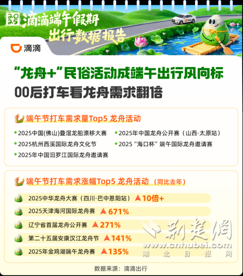 荊楚網(湖北日報網)訊(通訊員肖鞠仁)今年端午假期,在端午和“六一”雙節帶動下,在返鄉流、旅游流多線交織中,出行需求顯著上漲。滴滴出行數據顯示,端午假期打車需求同比去年上漲31%,餐飲美食和購物場所位列打車需求量Top2熱門場景。00后成為打車看龍舟賽需求漲幅最高的群體,同比上漲超100%。滴滴發超2億司機補貼,上線多種獎勵活動,助力司機師傅提升收入。