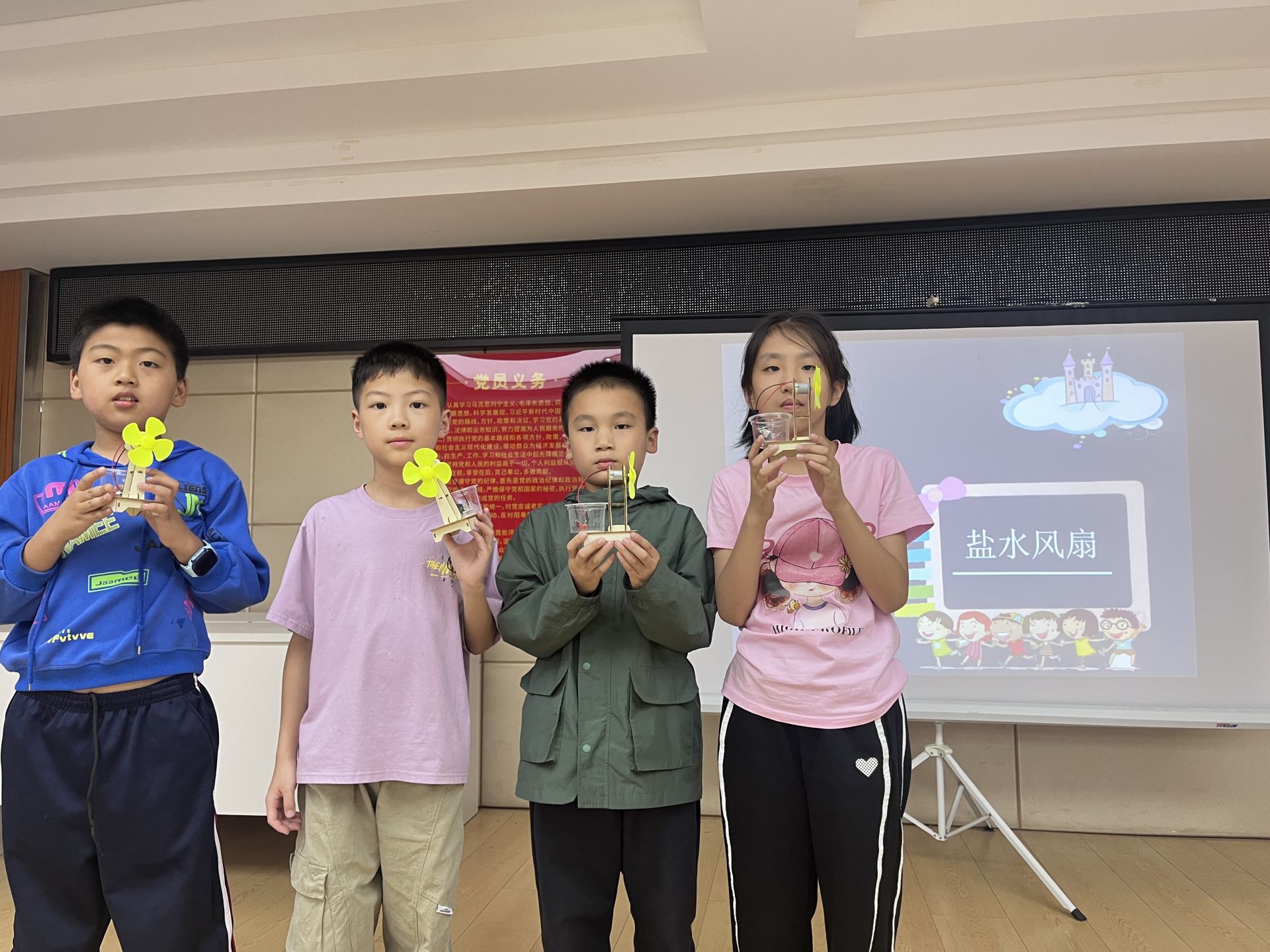 第二場實驗以“鹽水發電”為核心,老師從生活中的電池切入,通俗解析鹽水通過化學反應轉化電能、驅動風扇的原理。孩子們領取材料后專注組裝電路,倒入鹽水時屏息凝神,當風扇隨電流轉動,現場瞬間沸騰。“鹽水真的能發電!” 驚嘆聲此起彼伏。小組討論環節,孩子們更發散思考“不同濃度鹽水對轉速的影響”“替代溶液的可能性”,老師逐一解答并鼓勵創新思維。