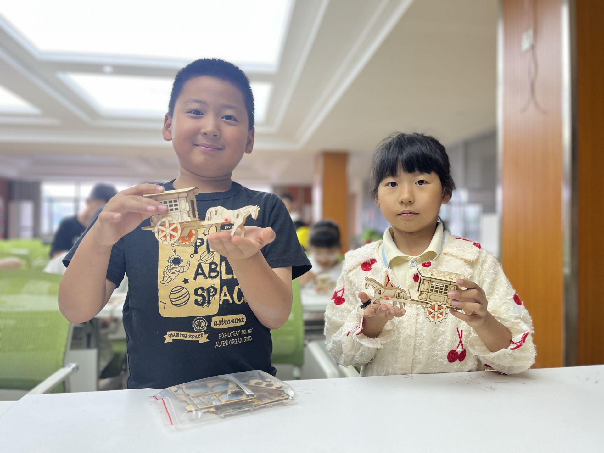 首場活動中,科學老師以生動講解串聯起古代馬車構造至現代交通的演變史,拆解“力的作用”科學原理。孩子們聚精會神聆聽,頻頻拋出童真問題。在模型制作環節,他們分組協作拼接零件、調試車輪,當親手制作的模型馬車在拉力驅動下前行時,現場爆發出陣陣歡呼。“原來力能讓馬車跑起來!”孩子們在實踐中直觀理解物理原理,更通過互動問答鞏固知識。