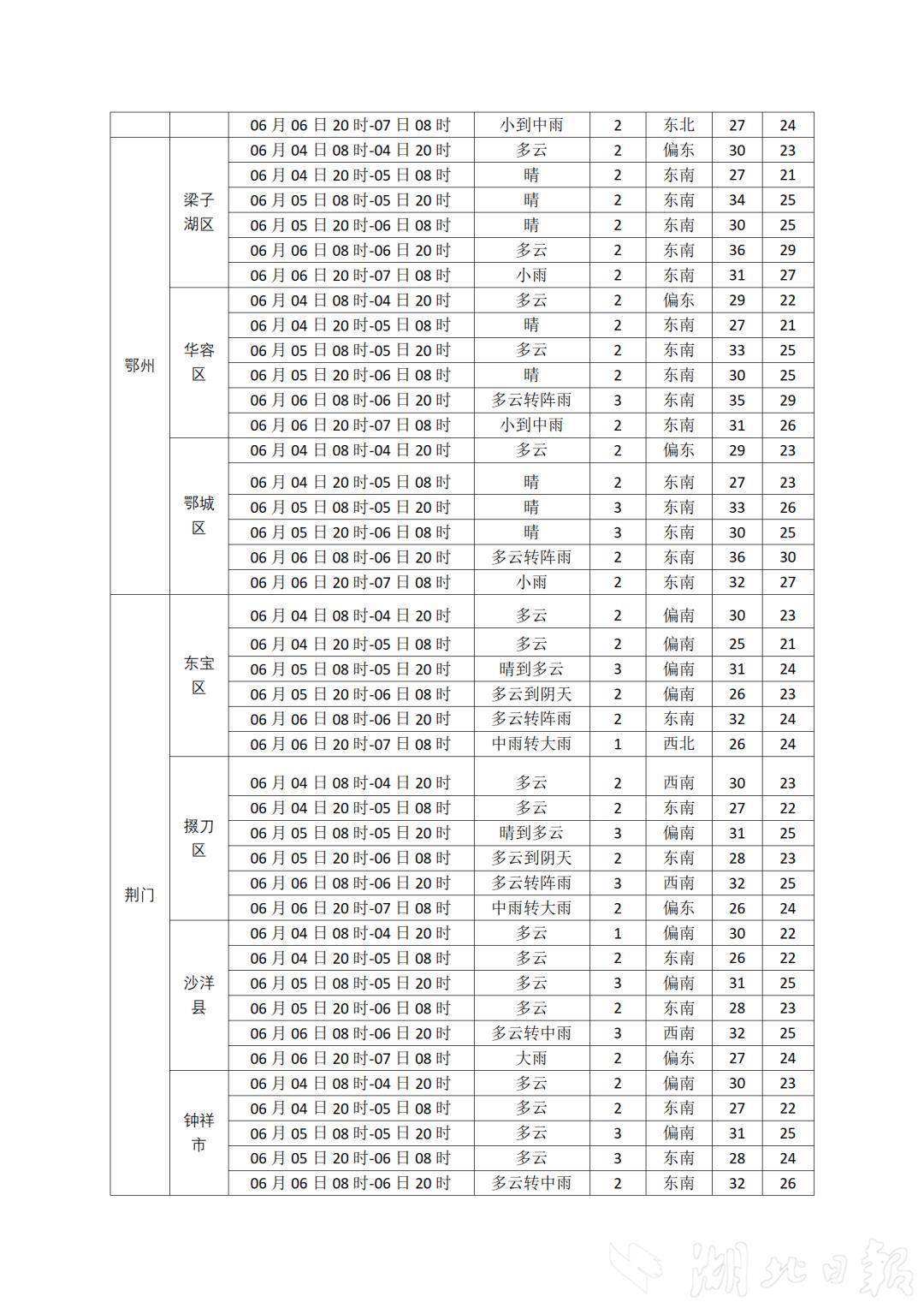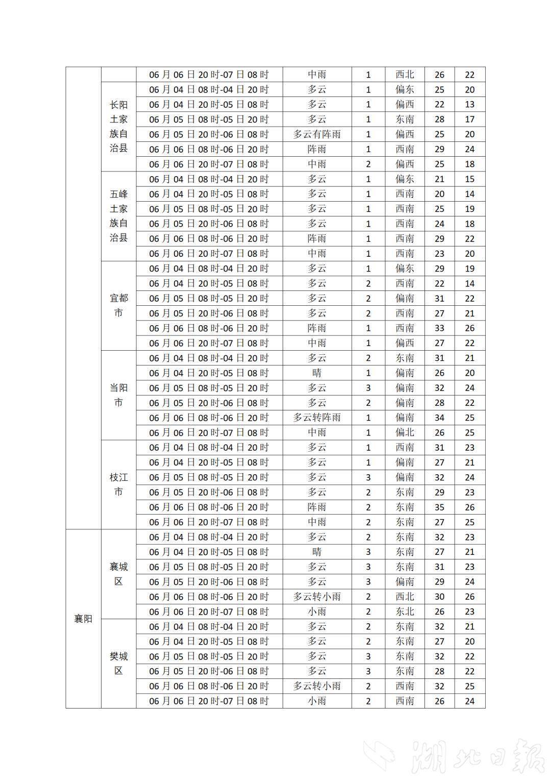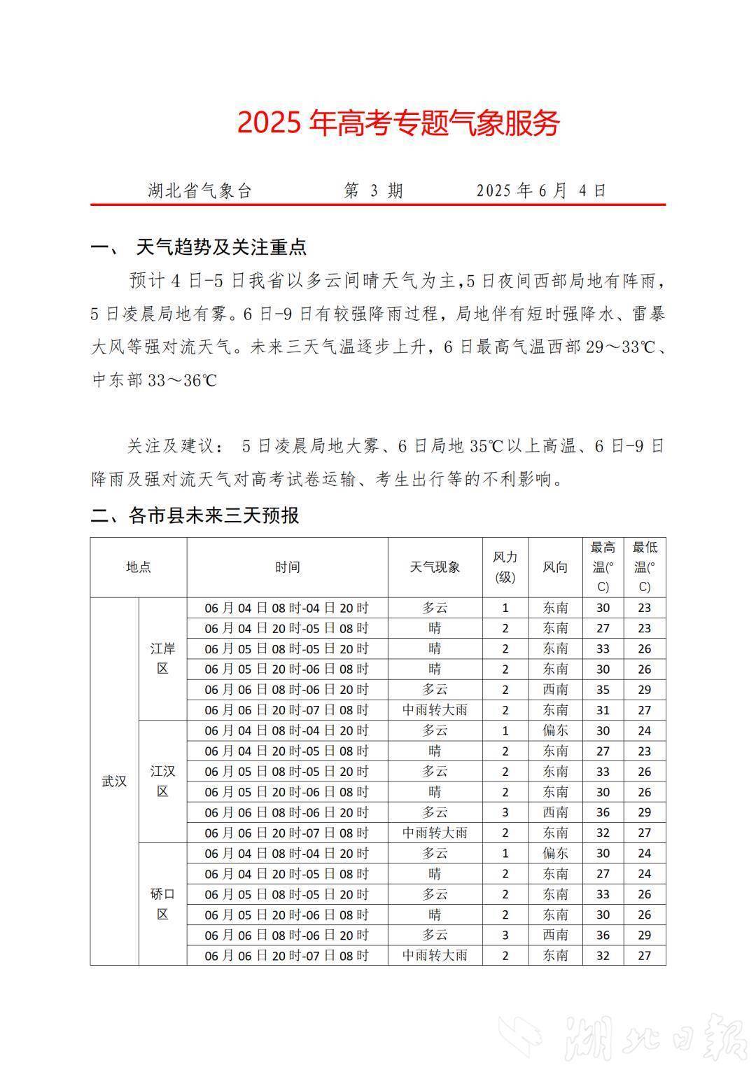 湖北日報訊(記者曾莉)高考進入倒計時!6月4日,湖北省氣象臺發布2025年高考專題氣象服務預報,預計6月4日-5日湖北以多云間晴天氣為主,5日夜間西部局地有陣雨,5日凌晨局地有霧。6日-9日有較強降雨過程,局地伴有短時強降水、雷暴大風等強對流天氣。預計接下來三天氣溫逐步上升,6日最高氣溫西部29℃至33℃、中東部33℃至36℃。