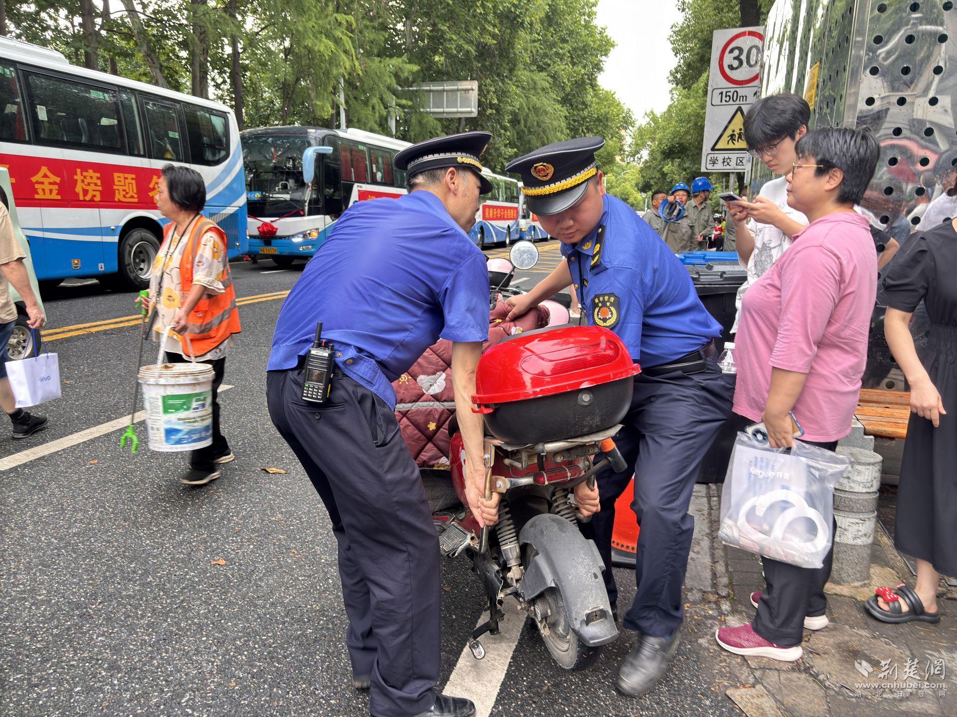 隨著考生和家長陸續抵達,吳中路與山北路交匯處的人行道上非機動車逐漸增多。為確保東西湖睿升學校、為明高中十多輛送考大巴順利停靠,城管隊員與交警分工協作,交警指揮機動車輛繞行五環大道,城管隊員則引導非機動車規范停放。“黃威,搭把手!”見幾輛電動車占用人行道不規范停放,執法隊員王小軍迅速招呼隊員們將車輛抬至指定區域,騰出安全通道。