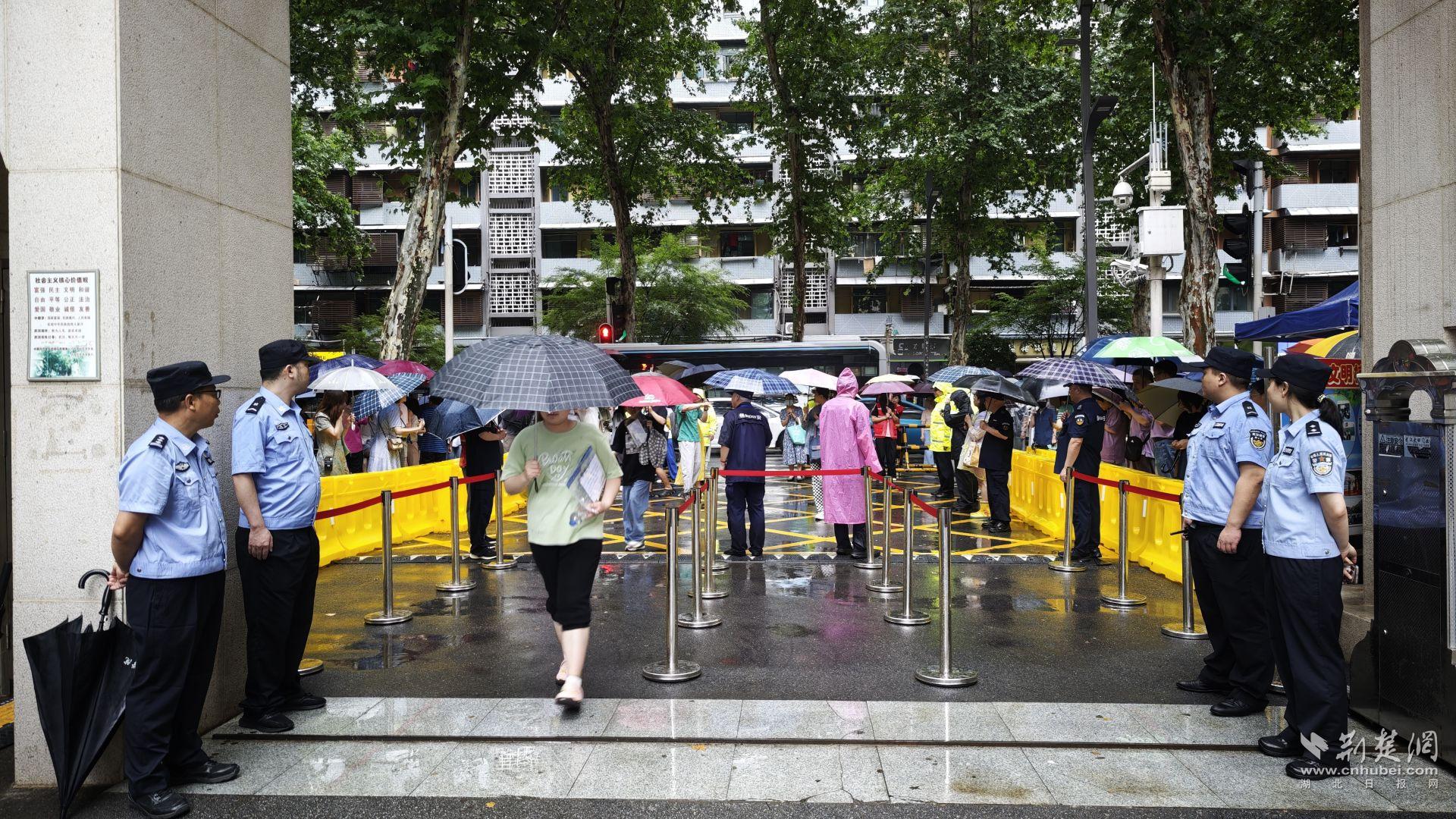 在武漢市漢鐵高級中學考點,民警穿梭在送考人群中,有人為忘帶雨具的考生撐傘護送,有人幫助學生固定被風吹翻的雨衣,喇叭里傳來的響亮提示,告知家長們不要聚集堵塞通道。“祝你們踏過‘成功門’!”在考點門口,百步亭派出所社區民警沈勝文面帶笑容,向考生們送上真摯的祝福。