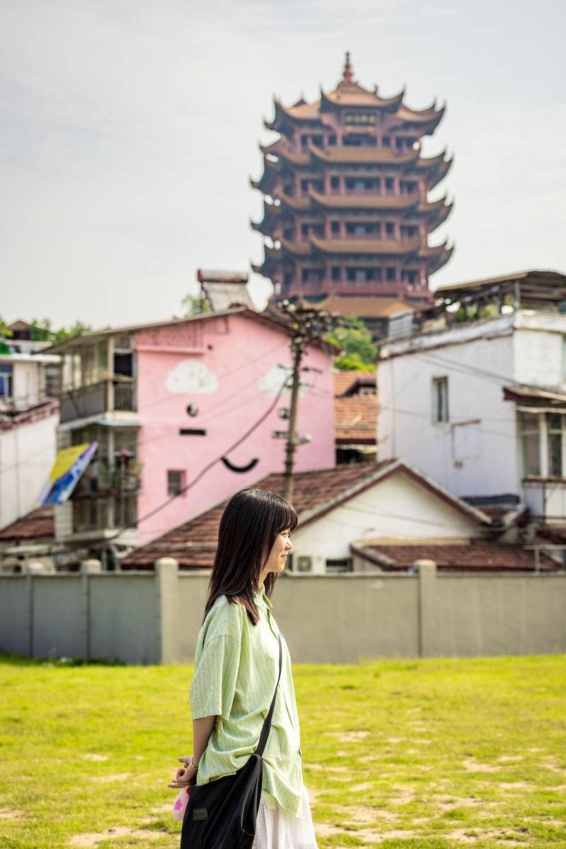 首站位于黃鶴樓南路人行道上,此處位于黃鶴樓正南270米處,可清晰拍到樓上“南維高拱”匾額。旁邊西廠口社區大草坪上,一棟民房側墻刷有粉色笑臉墻,結合草坪上“我愛武漢”的裝置陳設,構成了第二機位。