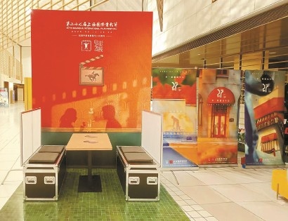 在陸家嘴百麗宮影城的主視覺海報前,一桌二椅皆成實景,影迷可以入內拍照留念,也可在此交談、小憩。 上海國際電影節(jié)供圖