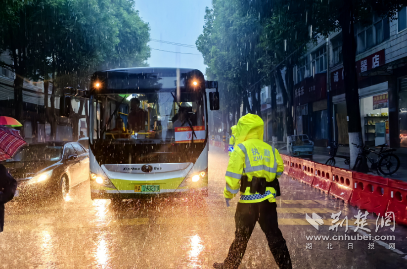交警暴雨中指揮引導(dǎo)送考車輛。通訊員供圖