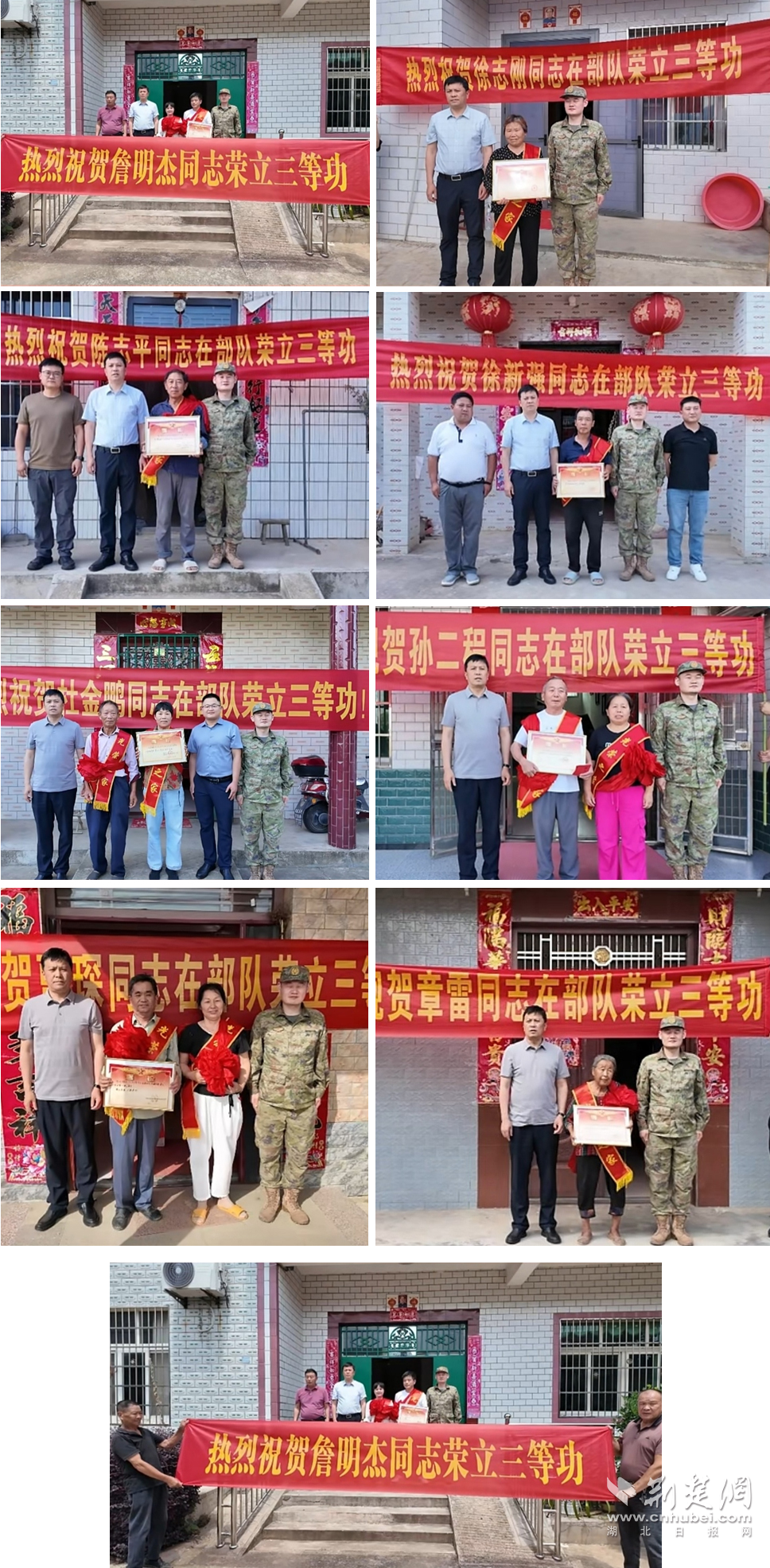 荊楚網(湖北日報網)訊(通訊員常夢星)一人立功,全家光榮。6月以來,團風縣退役軍人事務局聯(lián)合縣人武部組成“送喜報專班”,先后走進上巴河鎮(zhèn)、馬曹廟鎮(zhèn)、淋山河鎮(zhèn)、回龍山鎮(zhèn)、團風鎮(zhèn)等5個鄉(xiāng)鎮(zhèn),為章雷、曹琛、孫二程、杜金鵬、詹明杰、夏明海、徐新強、陳志平、徐志剛等9名榮立三等功的現(xiàn)役軍人家庭,送去喜報和慰問金,向他們表達最真摯的敬意和關懷。