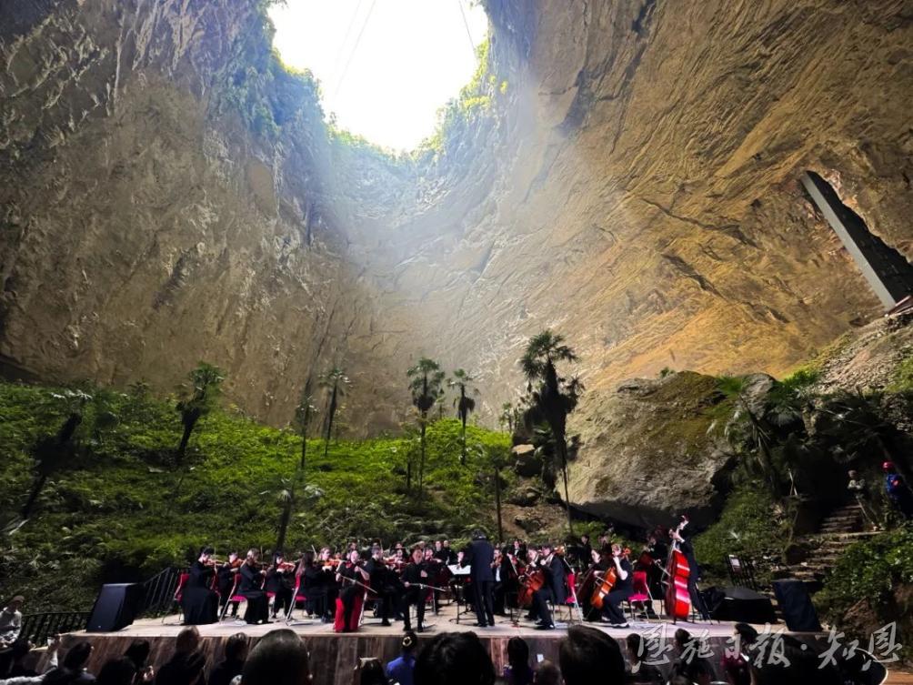 宣恩縣黨員干部打破常規思維“封印”,在矅天眼景區舉辦“天坑交響音樂會”,讓古典樂章回蕩在290米深的天然“音樂廳”,吸引央視等主流媒體關注。
