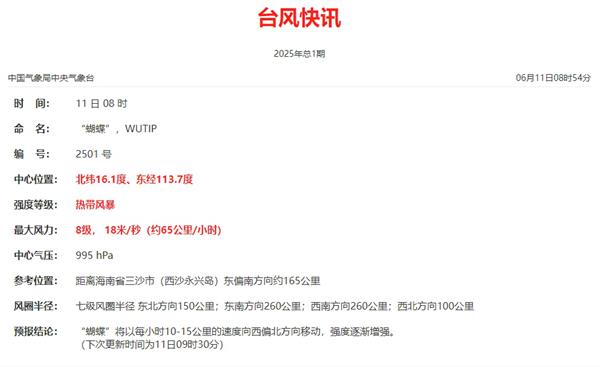 今天(6月11日)8時前后,南海熱帶低壓增強為今年第1號臺風“蝴蝶”(熱帶風暴級,英文名稱:WUTIP;名字來源:中國澳門;名字意義:一種昆蟲)。預計“蝴蝶”將于13日在海南島南部到廣東西部一帶沿海登陸。