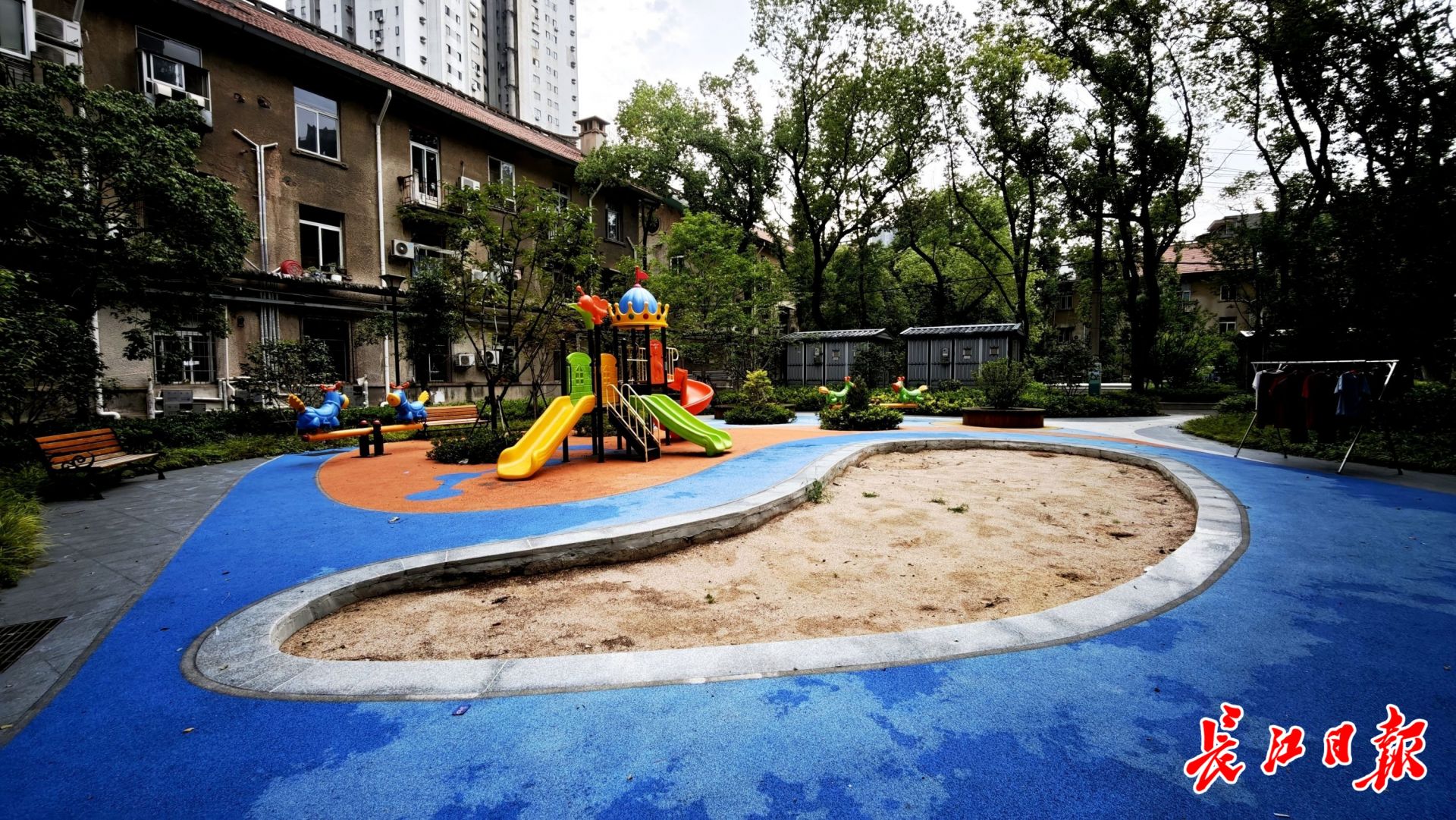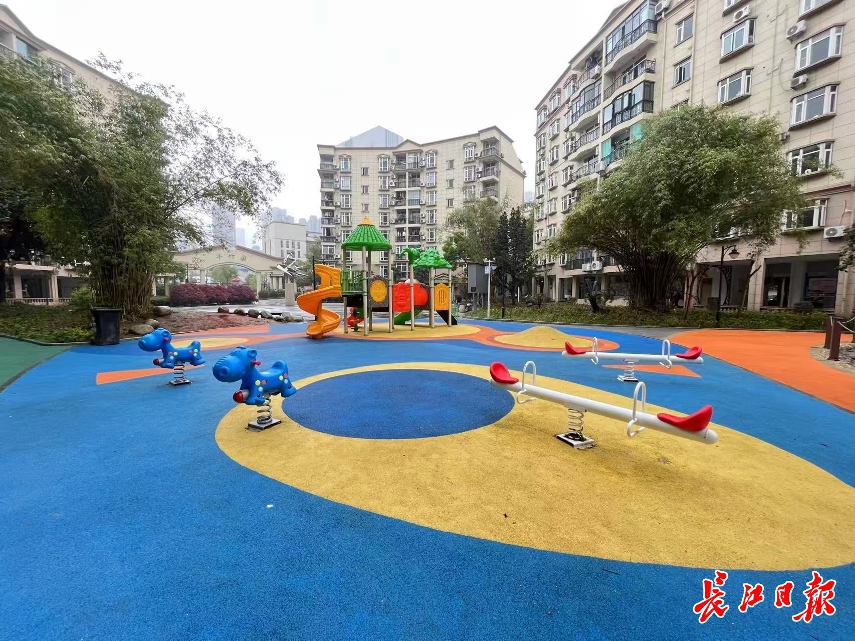 6月5日,長江日報記者來到武昌區中建院小區,一眼就看到被4棟樓房包圍的居民公共活動空間。這個空間由一排大樹自然分隔,一邊是色彩斑斕的兒童樂園和沙池,另一邊是可供老人休憩聊天、舉辦表演的簡易舞臺與座椅。