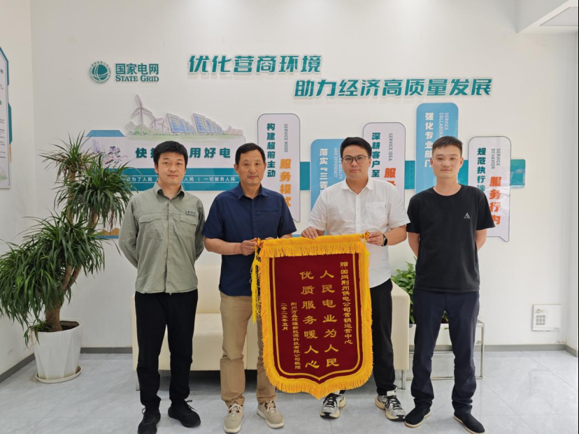 荊楚網(湖北日報網)訊(通訊員 謝松)近日,荊州萬晶輝源新能源科技有限公司負責人將寫有“人民電業為人民,優質服務暖人心”的錦旗送到國網荊州供電公司營銷運營中心,感謝該中心的優質服務。