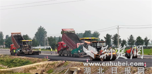 6月10日,在331省道磷礦鎮尤集段施工現場,記者看到,一輛輛載重汽車在攤鋪機的推動下,緩緩將熱氣騰騰的瀝青混合料倒入攤鋪機料斗,隨著壓路機等設備高效運轉,工人們忙著攤鋪、碾壓、封邊,大家分工協作,建設場面一片火熱。