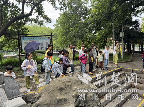 活動當天,轄區20組家庭在社區志愿者的帶領下,沿著研學路線,依次探訪龍泉十亭、象山四泉、張自忠紀念館、陸夫子祠、鳳鳴門……。“‘龍泉十亭’是對龍泉一帶的諸多古建筑所組成風景區的統稱。古時,荊門城西的象山東麓有四大名泉,分別是蒙泉、惠泉、順泉和龍泉。”每到一處,社區志愿者便化身“歷史導游”,以生動有趣的方式講述著這些古跡背后的故事,孩子們聽得津津有味,不時舉手回答問題,“我知道,‘宇宙便是吾心,吾心即是宇宙’就是陸夫子提出來的。”