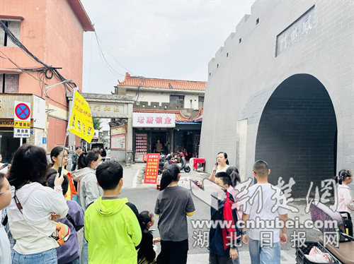 在陸夫子祠,孩子們聆聽了陸九淵的生平事跡和學術成就,感受到了古代文人的風骨與智慧。在鳳鳴門、南薰門下,志愿者講述了這座古老城門的歷史變遷,孩子們仿佛穿越時空,看到了昔日學子過南橋入文廟的繁華景象。“我知道荊門古城有五門,分別是東作門、西成門、北辰門、南薰門、鳳鳴門。”“我還知道鳳鳴門城樓上以前有文昌樓,左邊有魁星閣,右邊有文峰塔。”小朋友們爭相分享今天研學的收獲。