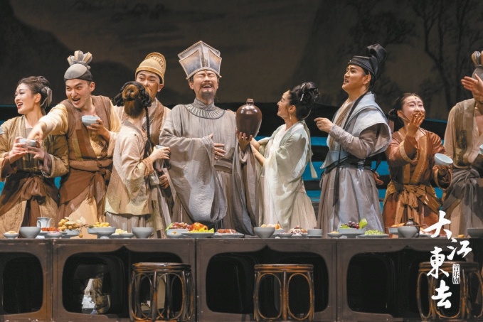 無論敘事還是音樂,《大江東去》都足夠飽滿。舞臺上,蘇軾到黃州后的重要事跡相繼呈現。我們看到他的好友陳季常和馬夢得尋友到訪,看到徐太守贈地供他開墾,看他寄情山水、飲酒賦詩,看他建雪堂、救溺嬰,看他煮“東坡羹”、做“東坡肉”、釀“東坡酒”……那些詩詞名作也悉數登場,或被譜曲創作,或融于臺詞之中。