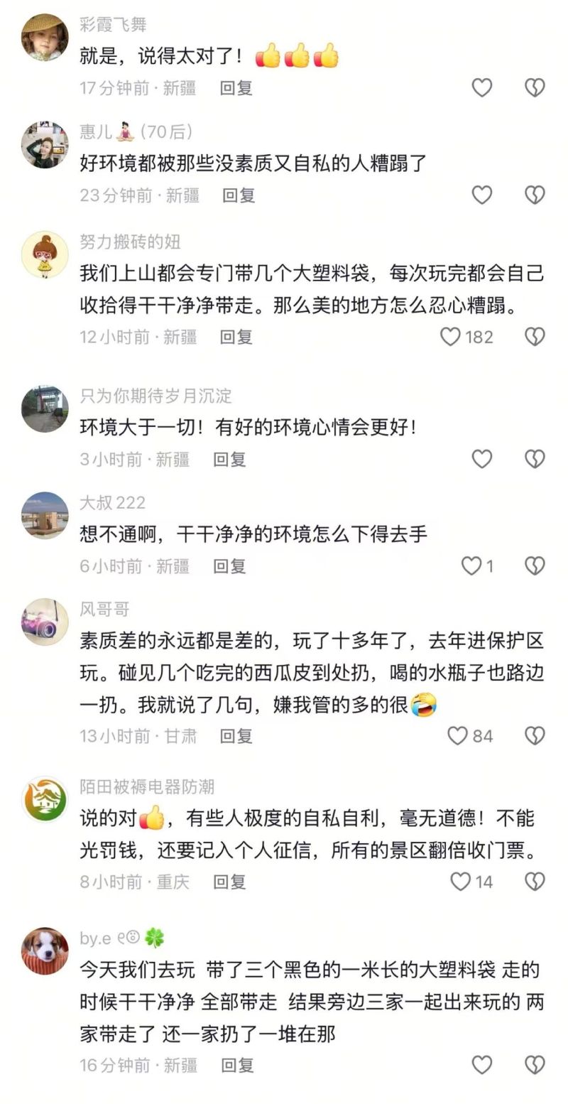 該區域毗鄰新疆網紅公路“天山地理畫廊”S101線。但部分自駕游客的不文明行為,讓這片美麗的土地蒙塵。當前正值古爾邦節假期,相關部門和熱心網友呼吁廣大游客在享受旅途、體驗自然之美的同時,務必提升環保意識,真正做到文明出游,共同守護大美新疆的綠水青山。