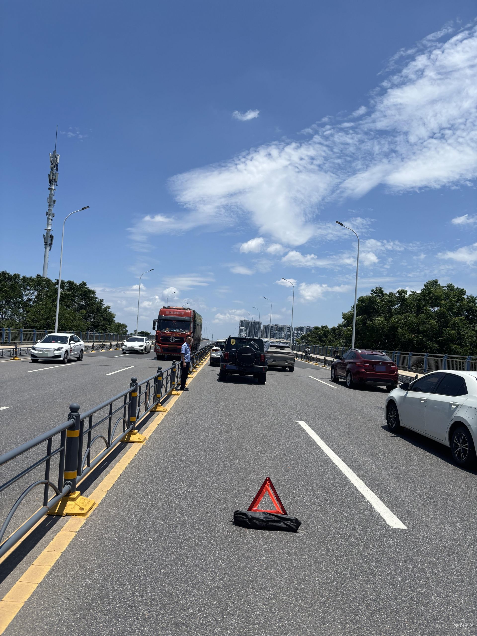 得知情況后,為防止后方車輛因視線受阻引發追尾碰撞等事故,陳吉與常樂第一時間在故障車輛后方規范放置三角警示架,為后方來車亮起醒目的“安全信號燈”,并堅守在烈日炙烤的路面,有序指揮疏導交通。