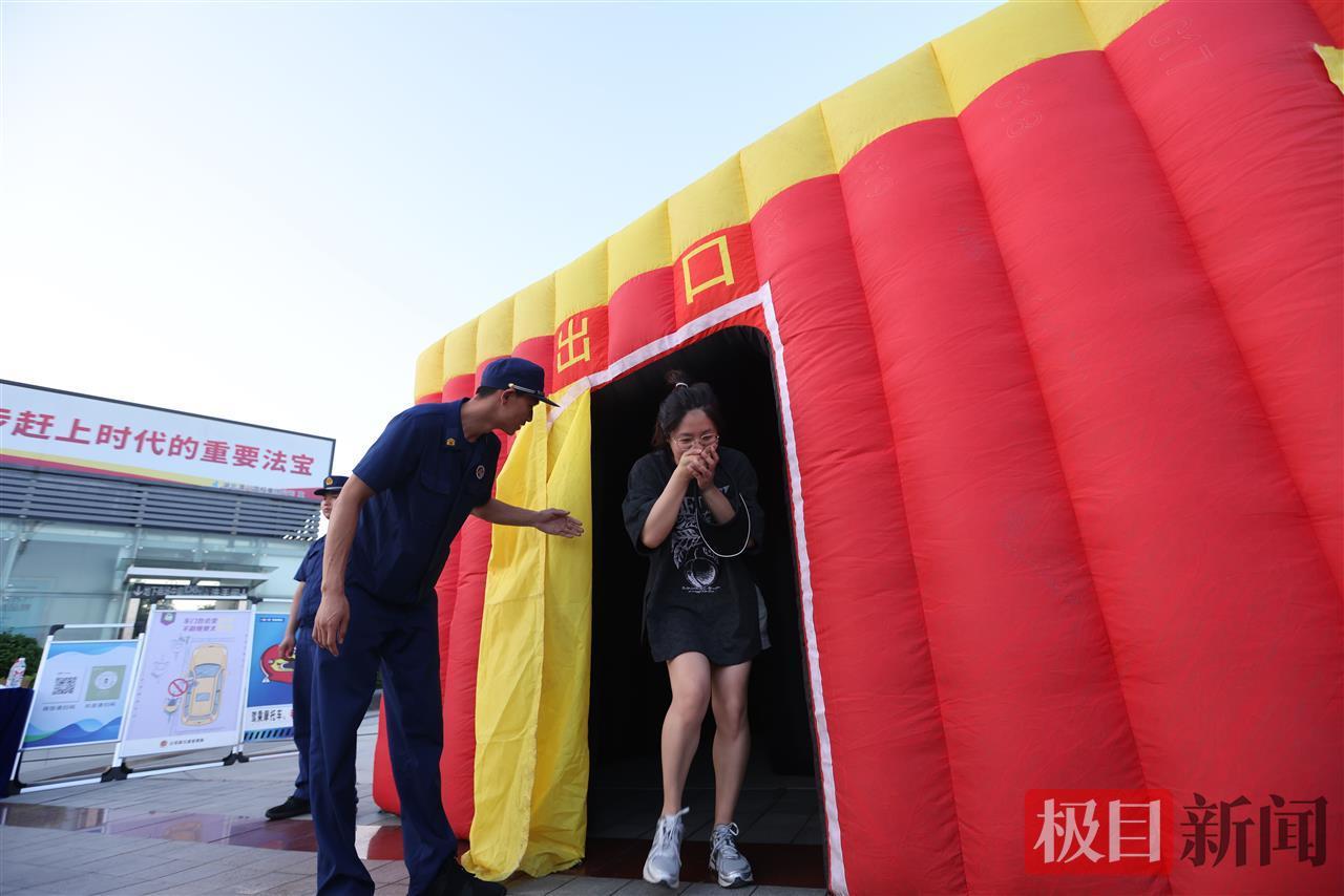 在消防員的指導下,市民分組進入模擬火災現場的黑暗帳篷,彎腰低姿、用濕毛巾捂住口鼻,沿著安全指示標志尋找逃生路線。