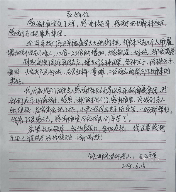荊楚網(湖北日報網)訊(通訊員 張芳蕾)“現在的幸福食堂大變樣,飯菜種類多,味道好,我們這些老人都很滿意!”6月17日上午,91歲退休老人親手將一封手寫感謝信送到楊園街道電力新村社區。字里行間滿是對幸福食堂、東湖康養集團及社區工作人員的謝意。這封樸實的信件,不僅是一位長者的心聲,更折射出社區為老服務的暖心升級。