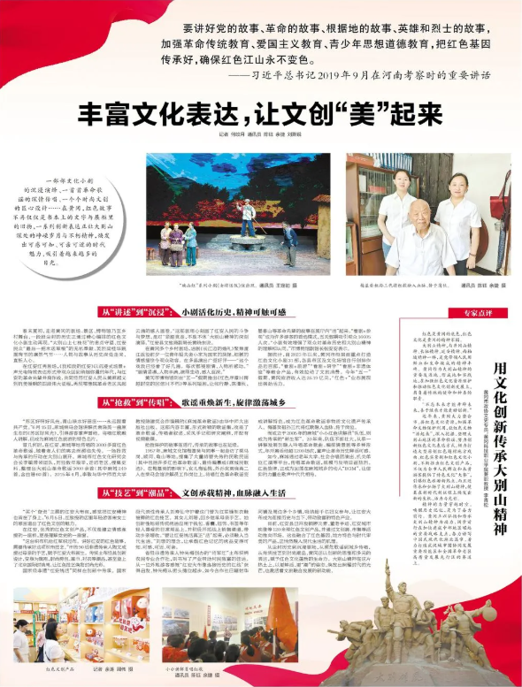近年來,黃岡大力整合市、縣紅色文化資源,加強(qiáng)革命文物保護(hù)利用,讓紅色文物“活起來”,深入挖掘、整理大別山地區(qū)的革命歌謠,努力創(chuàng)新紅色文化表達(dá)方式,傾力打造大型原創(chuàng)紅色題材地方戲曲、紅色實(shí)景劇和紅色文化小劇,不斷推出紅色文創(chuàng)產(chǎn)品,不僅為全市人民群眾和來黃游客提供了特色文化“大餐”,引爆紅色旅游新熱點(diǎn),而且還傳承和弘揚(yáng)了大別山精神,使其在新時代新征程上煥發(fā)出新的生機(jī)、活力與光彩。