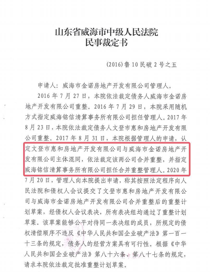 威海市中級人民法院民事裁定書及公開信息顯示,2017年8月31日,法院裁定惠和公司與威海市金諾房地產開發有限公司(簡稱“金諾公司”)合并重整,指定銘信清算事務所(山東)有限公司(簡稱“銘信清算”)擔任合并重整管理人。2020年5月10日,山東省倪氏房地產開發有限公司提出重整意向。經債權人表決,重整計劃草案獲得通過。2020年7月20日,法院裁定批準重整計劃草案。