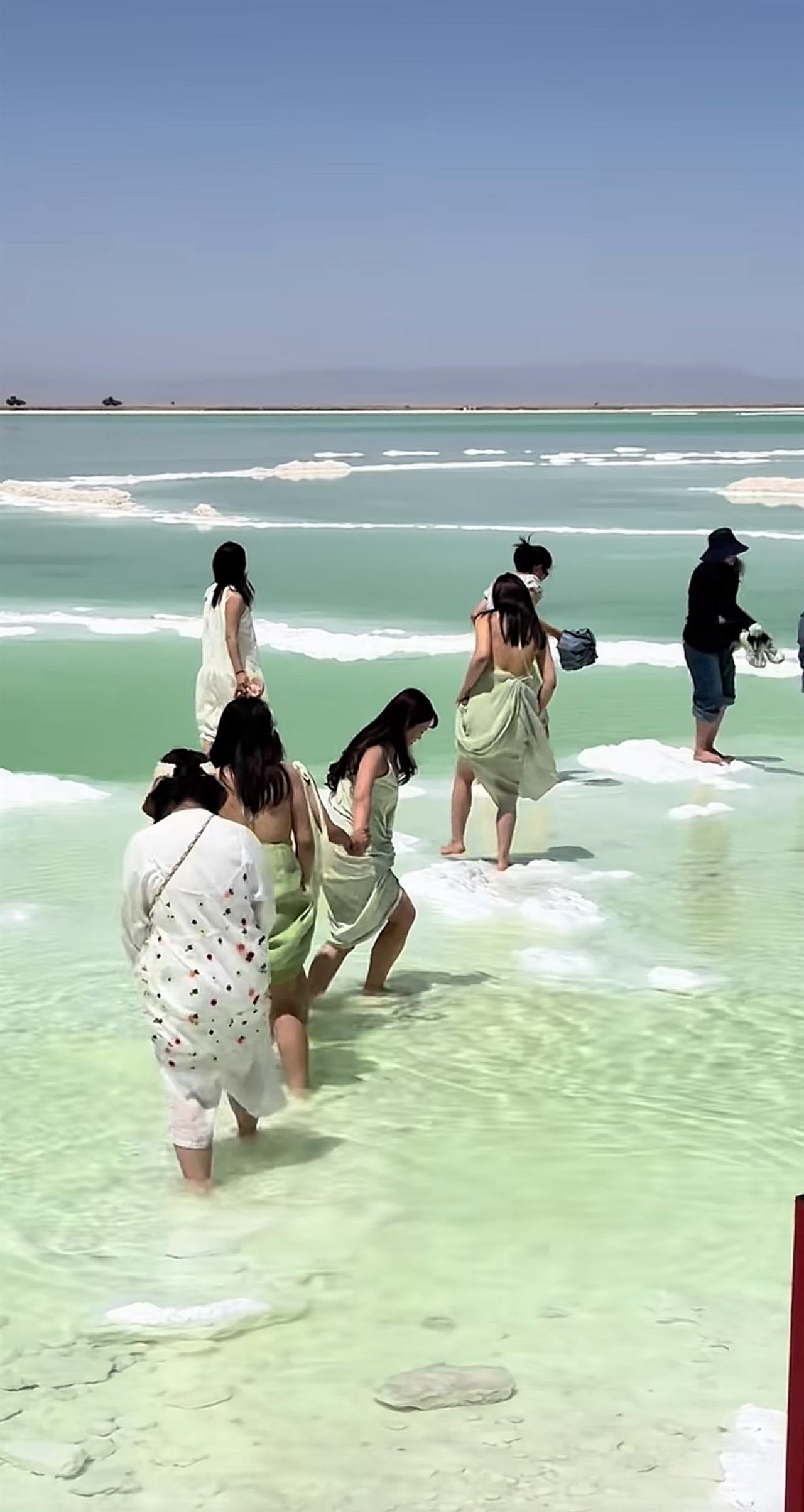有游客赤腳進(jìn)入察爾汗鹽湖 視頻截圖