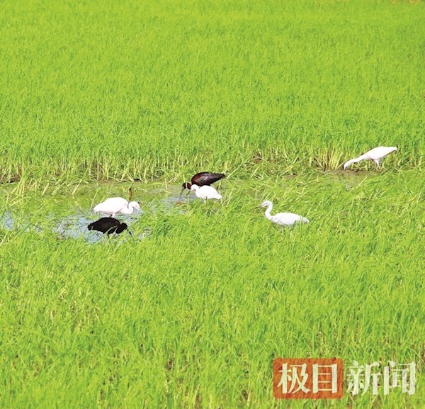 6月16日,初夏的湖北省孝感市朱湖國家濕地公園,翠綠的稻浪隨風(fēng)起伏,4只羽毛泛著栗色金屬光澤的國家一級重點(diǎn)保護(hù)動物彩鹮悠然立于田間。它們時(shí)而低頭覓食,時(shí)而振翅低飛,羽翼在陽光下折射出藍(lán)綠變幻的虹彩,宛如“濕地彩虹”翩躚起舞。這一珍稀種群從去年僅觀測到1只個(gè)體,今年則是以家庭為單位現(xiàn)身,標(biāo)志著孝感市朱湖濕地生態(tài)修復(fù)取得突破性成果。楚天都市報(bào)極目新聞記者陳勇 通訊員萬清平