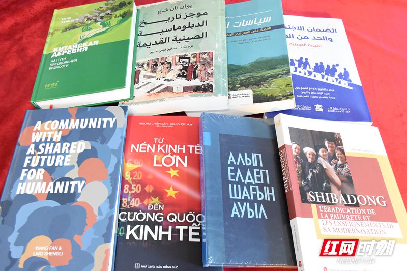 仲夏時節,走進湖南人民出版社十二樓會議室,一股淡淡的書香撲面而來,映入眼簾的一排書架上,擺放著《鄉村國是》(俄文版)、《大國小村》(哈薩克文版)、《人類命運共同體——全球治理的中國方案》(英文版)等眾多海外發行的圖書。